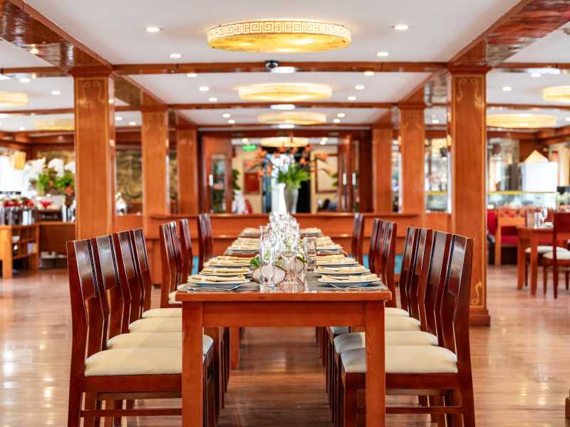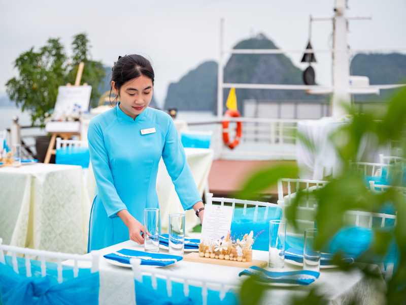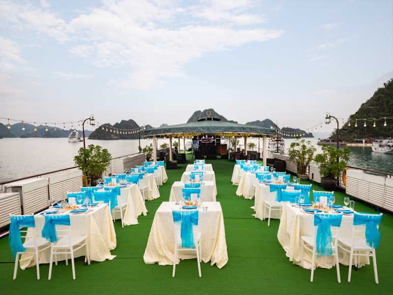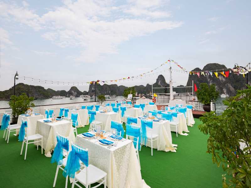 06:00 Warm up your day with a Tai Chi lesson on the sundeck with a breathtaking view as the sunrises on Halong Bay. Sunrise photo-hunting in the bay is once a lifetime experience; however, this activity is not mandatory. You can choose to stay in bed.