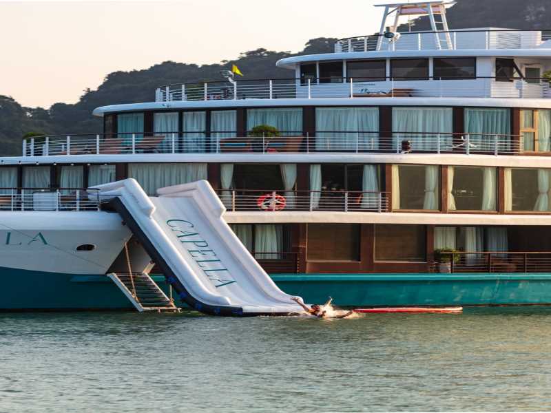 You can choose to rejoice in Infinity Oasis Pooland Jacuzzi, experience the thrills with Inflatable Water Slide,swim in the green emerald water,kayak/try SUP around the beautiful landscape of Lan Ha Bay, or try a Mini-Golf on the top deck.