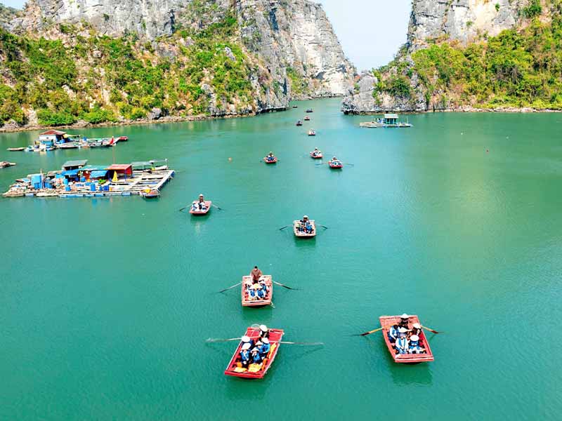 08.00 Riding on the rowing bamboo boat (row by the fisherman) to explore the Vung Vieng fishing village and learn about the local fishing life