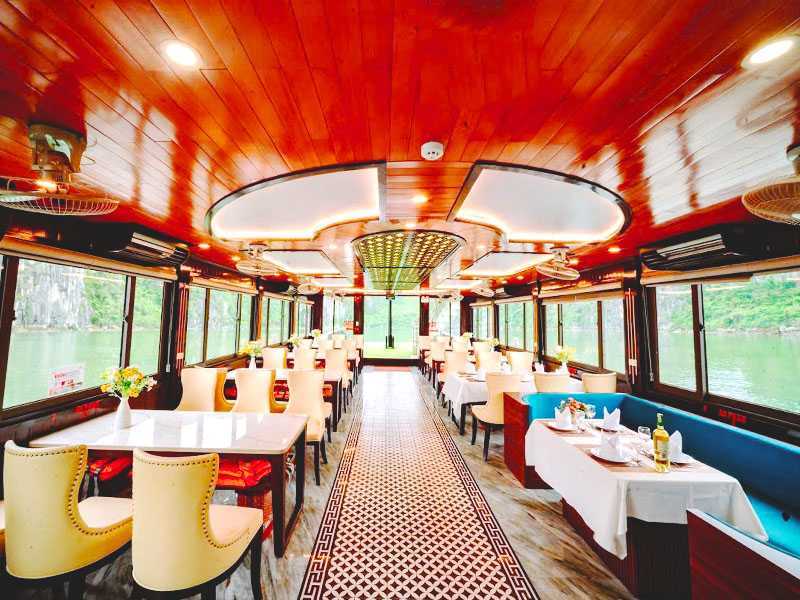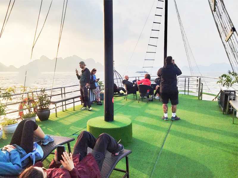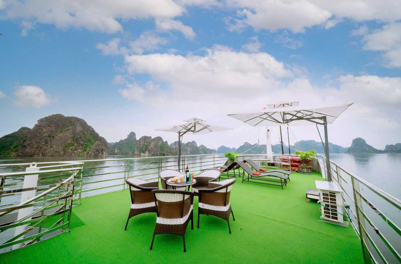 - Jacuzzi Time: Our boat features a Jacuzzi for your relaxation. The best time to soak is during the Sunset Party. Imagine relaxing in warm bubbles on the deck, a drink in hand, as the majestic scenery of Ha Long Bay passes by.