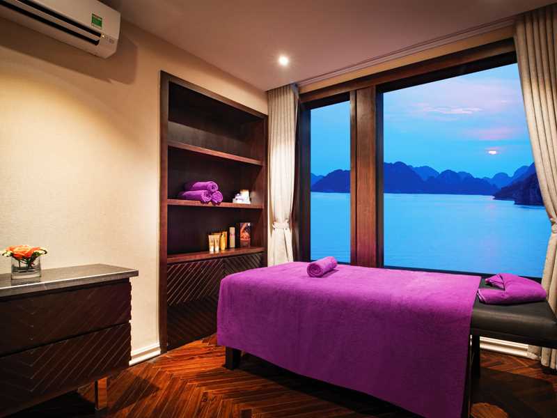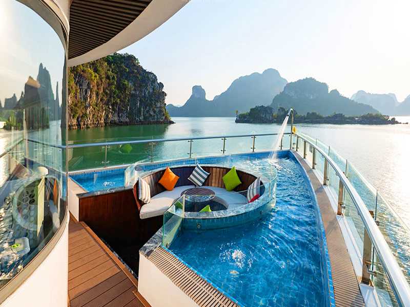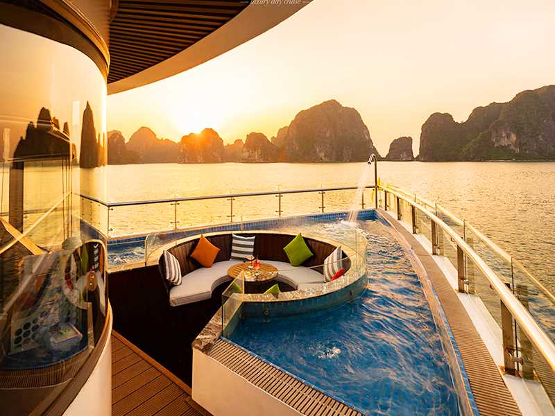 Summit on the sundeck to watch the magnificent sunset over the Seven Wonders of Nature, enjoy Sunset party. It’s the ideal time to make acquaintances with new friends, sharing your traveling experience or simply watching the sunset or just relax, while cruising back to Tuan Chau Marina. Or you can choose to relax at the big Zacuzzi that located in front of the cruise.