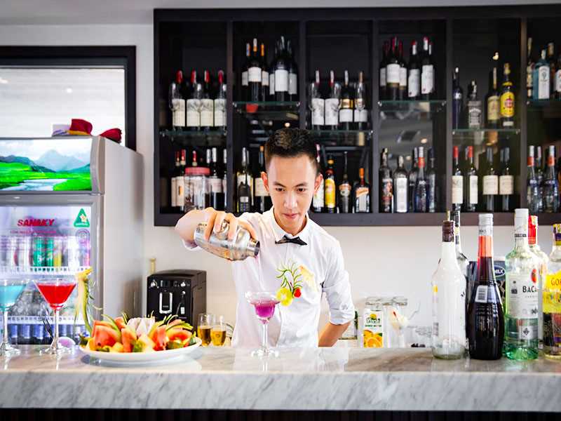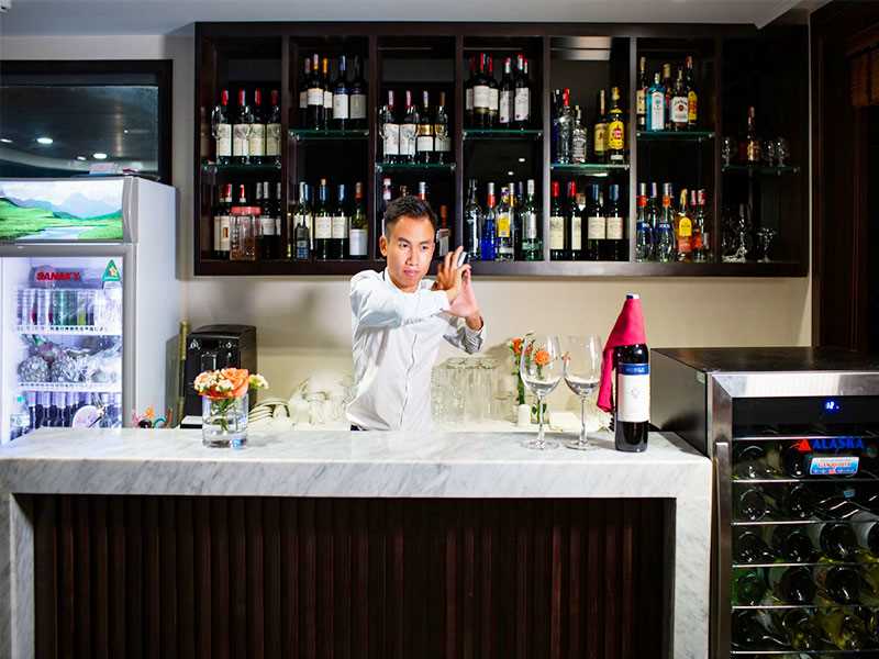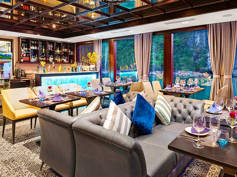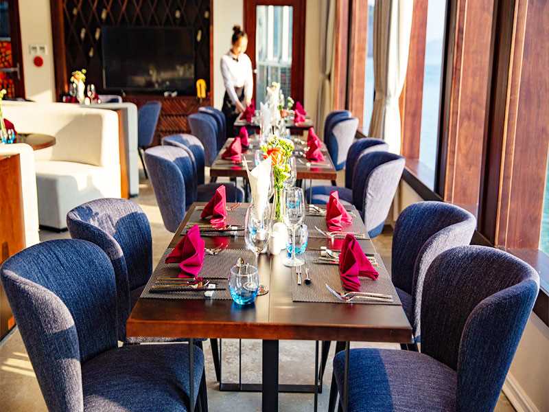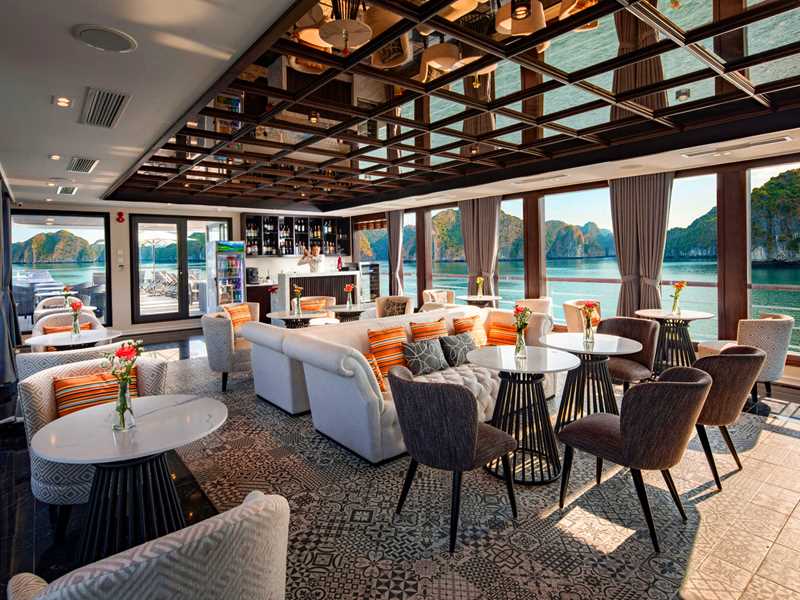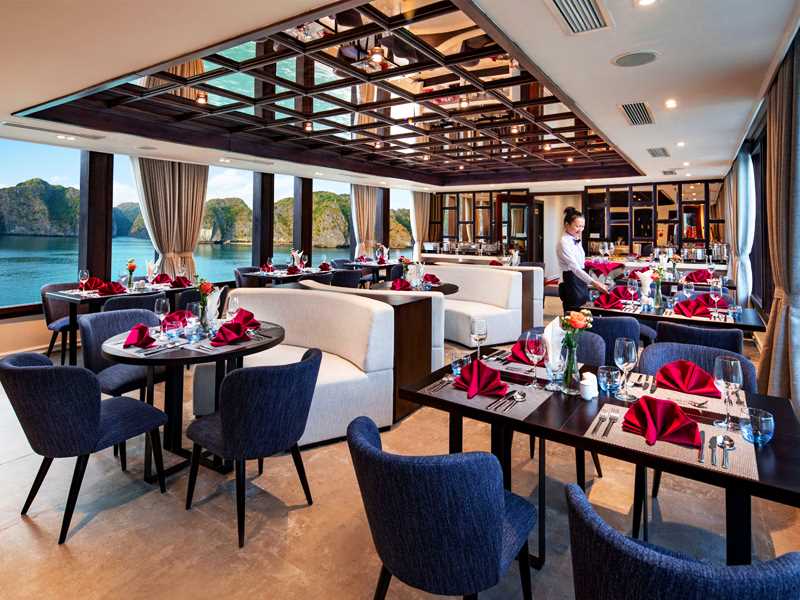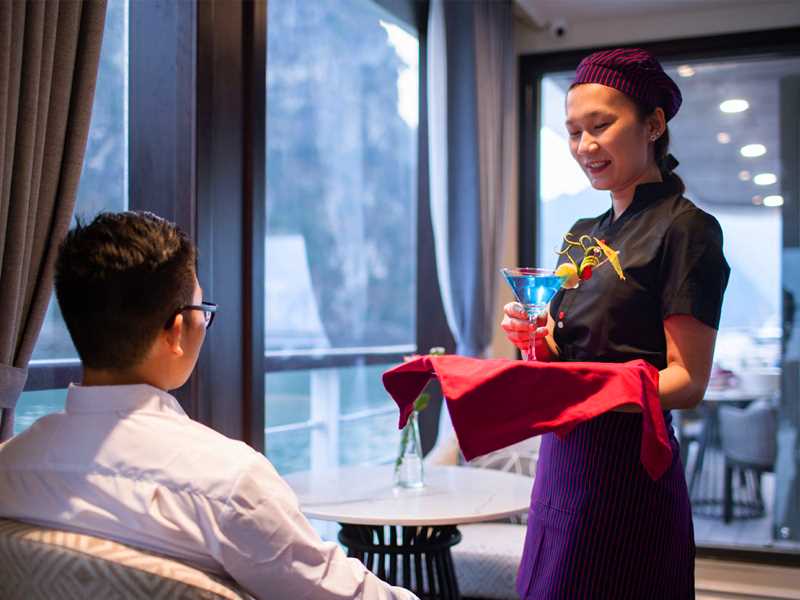 While cruising through a maze of towering limestone mountains, you revel in the elegant restaurant that full equipped with air-conditioning. A buffet lunch (western, Vietnamese and seafood) is served and spectacular seascape is always in view through expanded windows.