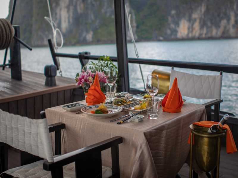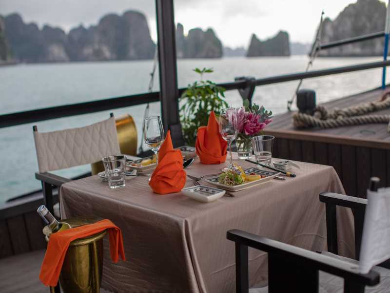 13:15: Have lunch at the onboard restaurant, featuring seafood dishes from Quang Ninh. The wooden boat will start its journey to explore Bai Tu Long Bay, passing through limestone islands and beautiful scenery along the bay.