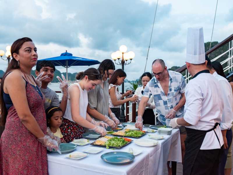 17:00 Return to Le Journey Elegance Cruise for a Sunset Party & Cooking Class. Join our HAPPY HOUR: Buy 02 get 01 drink while enjoying the amazing scenery while watching the sunset over the sundeck