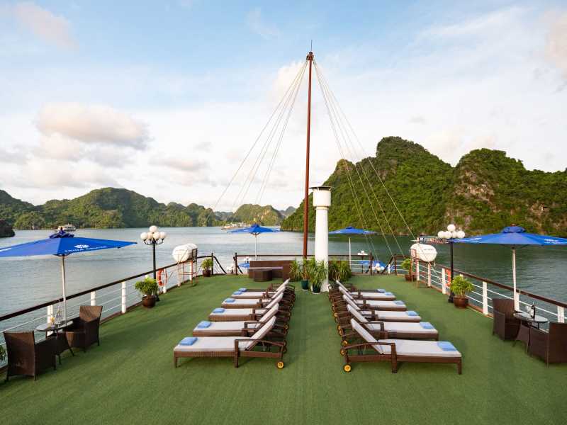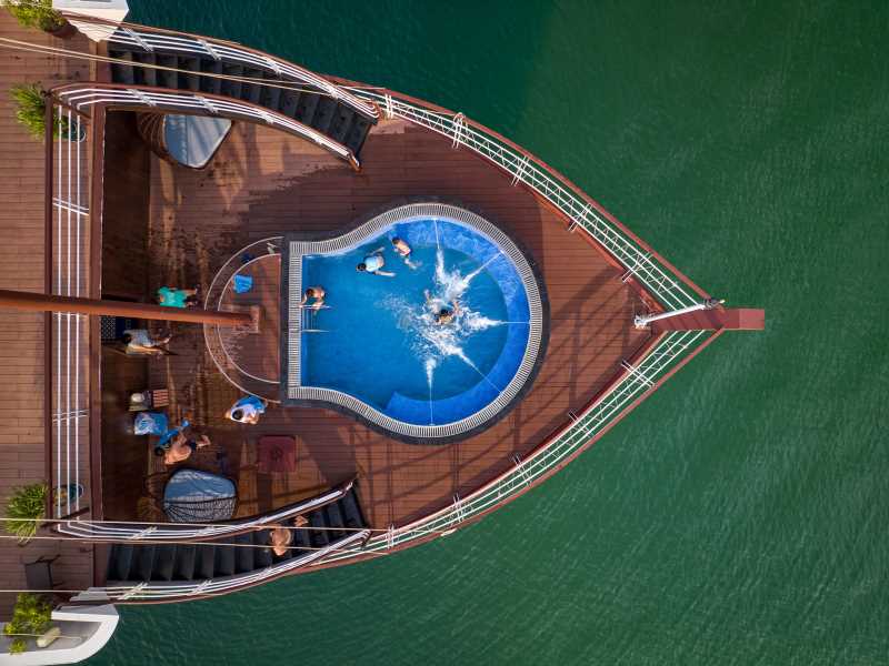 15:30 Back on Le Journey Elegance, where guests can enjoy a dip in the swimming pool on the second deck and admire the stunning sunset over Lan Ha Bay or experience therapeutic massage services right on board.