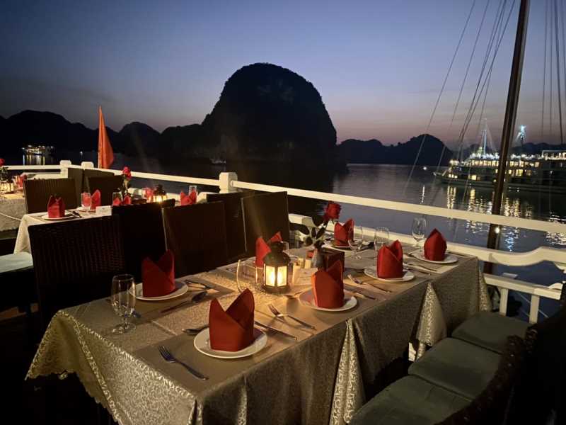 19:00 - 20:00 Enjoy your dinner on the Sundeck (if the weather is favorable). After dinner, you will enjoy a peaceful view of the Bay at night on the deck. Enjoying music and some drinks at Sky Bar while admiring the breathtaking view of the Bay at night or squid fishing. The cruise ship anchors for your peaceful night stay in quiet area
