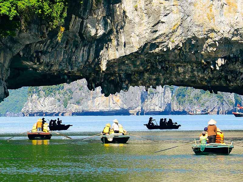 Visit the Dark & Bright Caves by traditional rowing bamboo boats or kayaking. Cruising to Bright Cave, you will see an angled passageway opening the caveat water level and a serene round lake surrounded by lush trees and precipitous stone cliffs