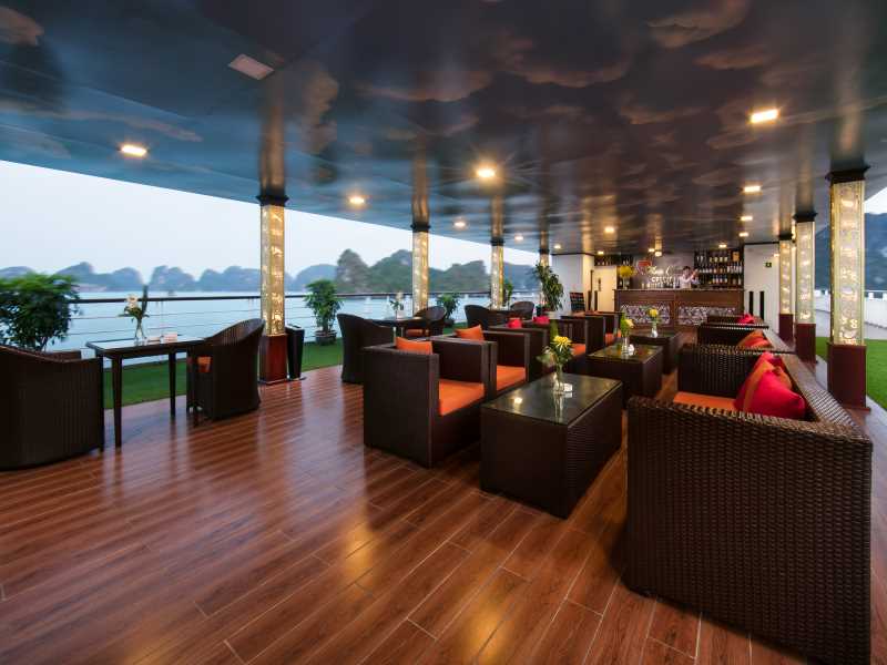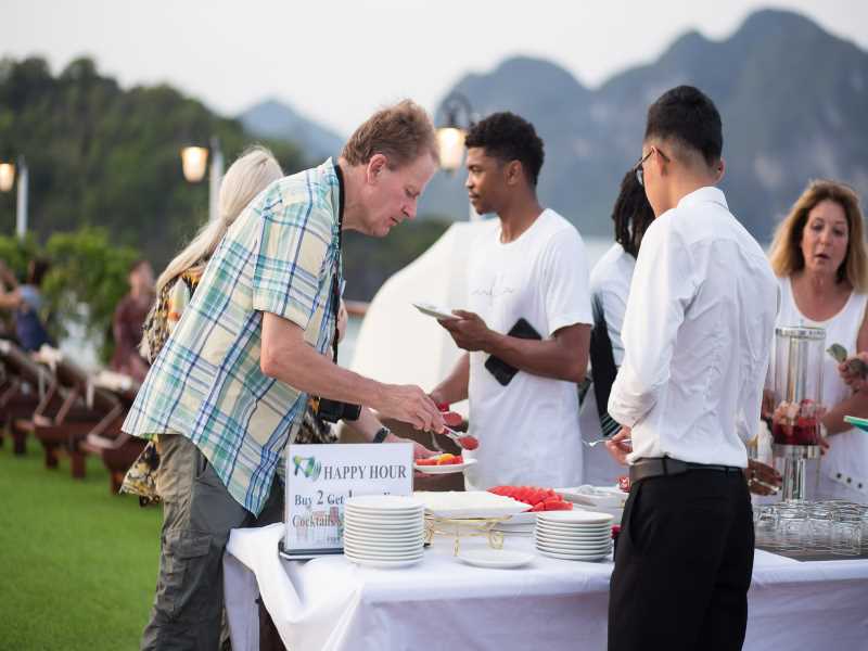 Joining us for Cooking demonstration to learn how to make one of the most famous Vietnamese cuisines, the spring rolls. Or reach the top deck of cruise where the guests can admire the magnificent sunset over the Gulf of Tonkin. Enjoy a Happy Hour time - BUY ONE GET ONE FREE at the bar. It is an ideal time for photography enthusiasts to capture the greatest moment of sunset over Lan Ha Bay.