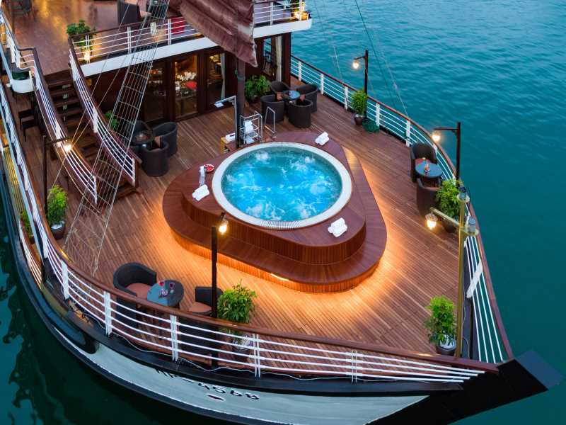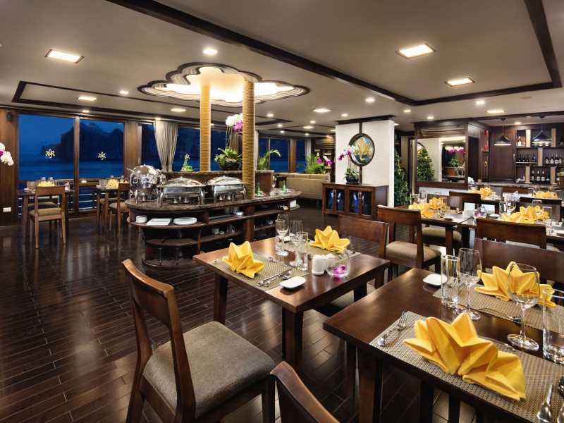 16:00 - 16:30 Return to Orchid Cruises. Guests may join a cooking class, take a swim at the untouched area, or enjoy the Happy Hour (buy 1 get 1) at the bar while watching the magnificent sunset over the Gulf of Tonkin.