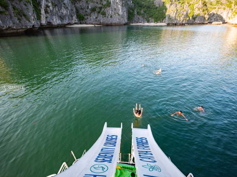 Our Captain and Tour Guide will choose the best stop for the group to experience interesting activities: Swimming in the middle of the sea, boat- jumping, sliding down from the top deck to cool water, kayaking,....