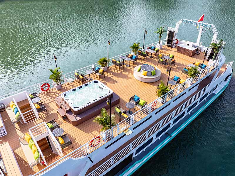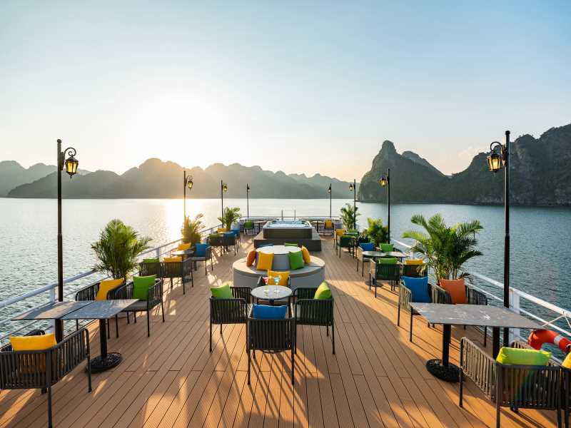 Return to the cruise and relax in the Jacuzzi on the sundeck. End your day with a lively Sunset Party: Wine, Tea, Fresh Fruits, Sweet Cakes, Music, and Dancing as the sunsets romantically over Lan Ha Bay, while the cruise comes back to the harbor.