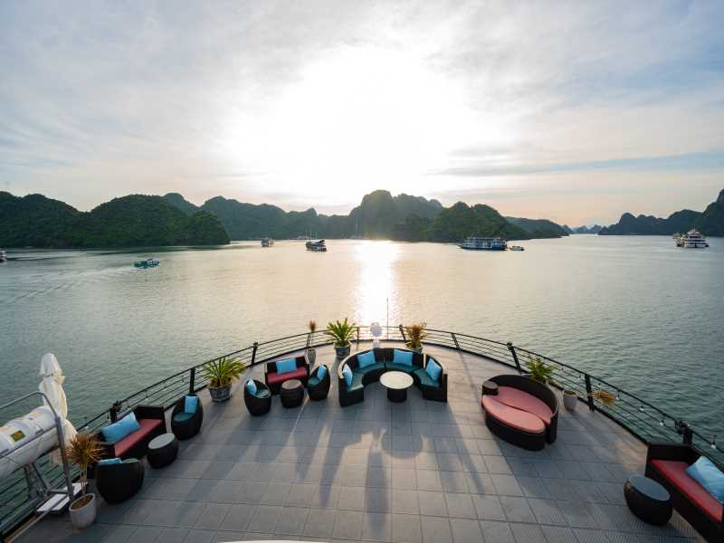 17:30 - 18:30 Enjoy the Sunset Party with fruits and snacks at Velar Sky Bar and Happy Hour will offer you a drink at an attractive price. Happy together, watching the Sun falling into the sea will be unforgettable memories for every single traveler on board.