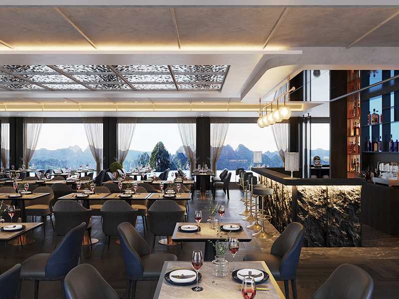13:00 | A refined lunch featuring fresh Ha Long seafood and traditional Vietnamese specialties is served at the cruise’s elegant restaurant. While savoring the exquisite cuisine, guests can admire the poetic beauty of Ha Long Bay unfolding before their eyes.